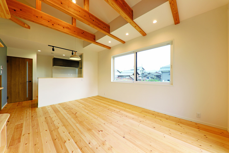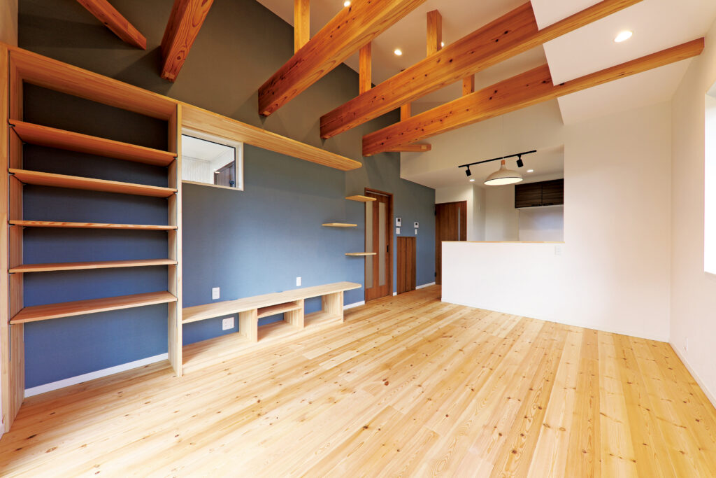 将来ネコちゃんを飼いたいとの思いからキャットウォークをつくり、リビングの天井を高く梁を出し、ネコちゃんが動き回れるように考えました。
